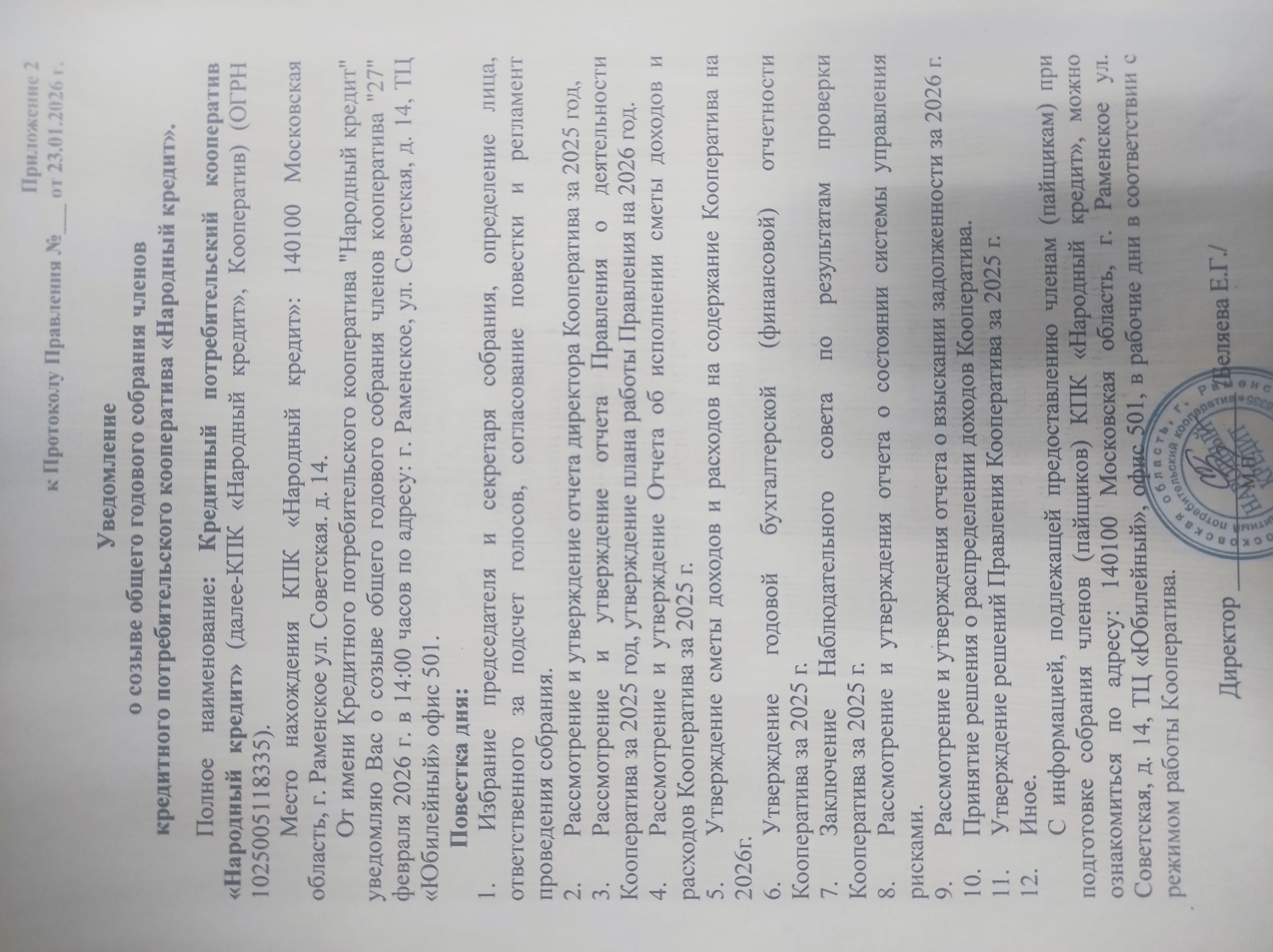 23 января 2026 года проведено заседание Правления. Решено провести Очередное Общее собрание членов КПК "Народный кредит" 27 февраля 2026 года.